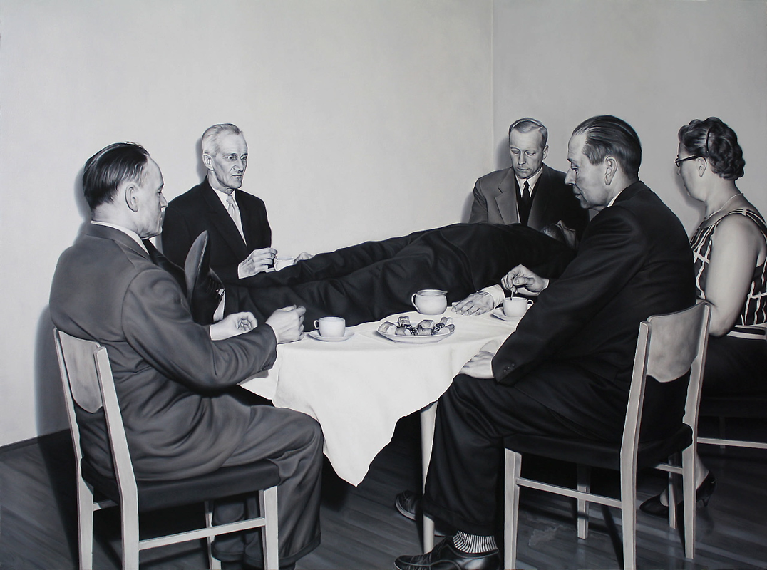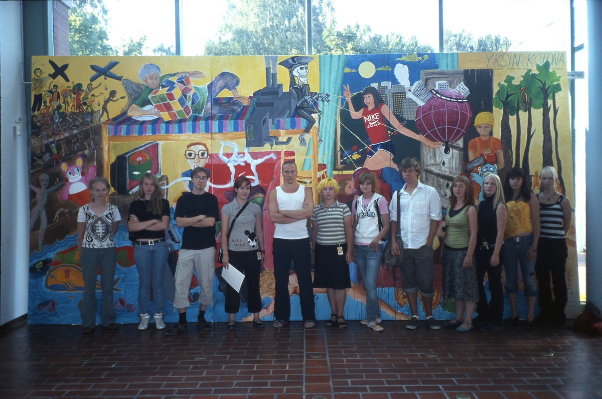 Teemu Mäki & Kollektiivi: Jouluntorjuntamaalaus / Painting to Exorcise the Xmas with. Kollektiivimaalaus, 210 x 400 cm, 6.12.2009 (Maalarit: Teemu Mäki & Sampsa Indrén, Anna-Liisa Kankaanmäki, Katariina Katla, Maija Ojanen, Nelli Penna, Kukka Ranta + Marsu). http://www.teemumaki.com/teemumakipaintingdrawingcollectives.html