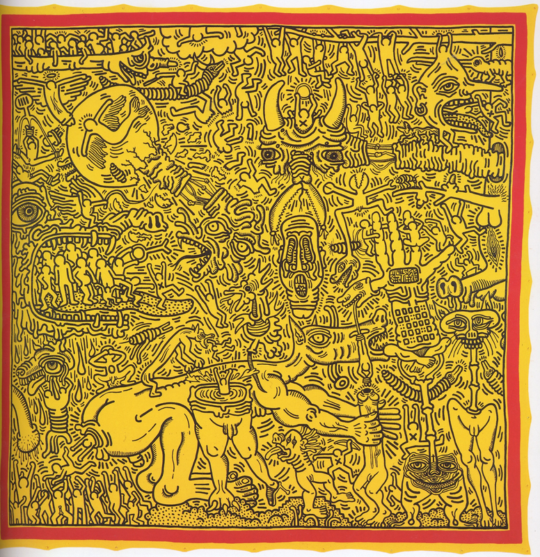 Keith Haring (1958–1990): Nimetön, 1986, muovimuste pressulle, Tate Gallery, Lontoo. Haringin maalauksen voi nähdä/lukea dystopiana, jossa koko maailma on pelkkä hyperaktiivinen väkivallan ja riiston koneisto – pienistä lemmenpilkahduksista huolimatta – mutta antoisampaa lienee keskittyä maalauksen siihen puoleen, joka ihastelee ja ylistää elämän-maailman-luonnon kuhinaa, luonnonkierron surkuhupaisaa raivokkuutta, kiistämättä sitä, että siinä kurimuksessa yksilön osa on usein tuskaisa, mutta hakien lohtua siitä, että kokonaisuus on niin täynnä elinvoimaa. Näin ajatellen tämä maalaus on tunne-elämän ei-moraalista venyttelyä ja turboahtamista uhkeamman olemassaolonkokemuksen saavuttamiseksi.
