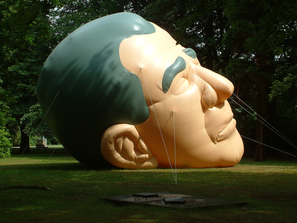 Paul McCarthyn (1945–) puhallettavia ulkoilmaveistoksia: Siat, Pullollinen Kapteeni Morgania, George Bush Jr. ja Paskakasa. Utrecht, Hollanti, 2009.