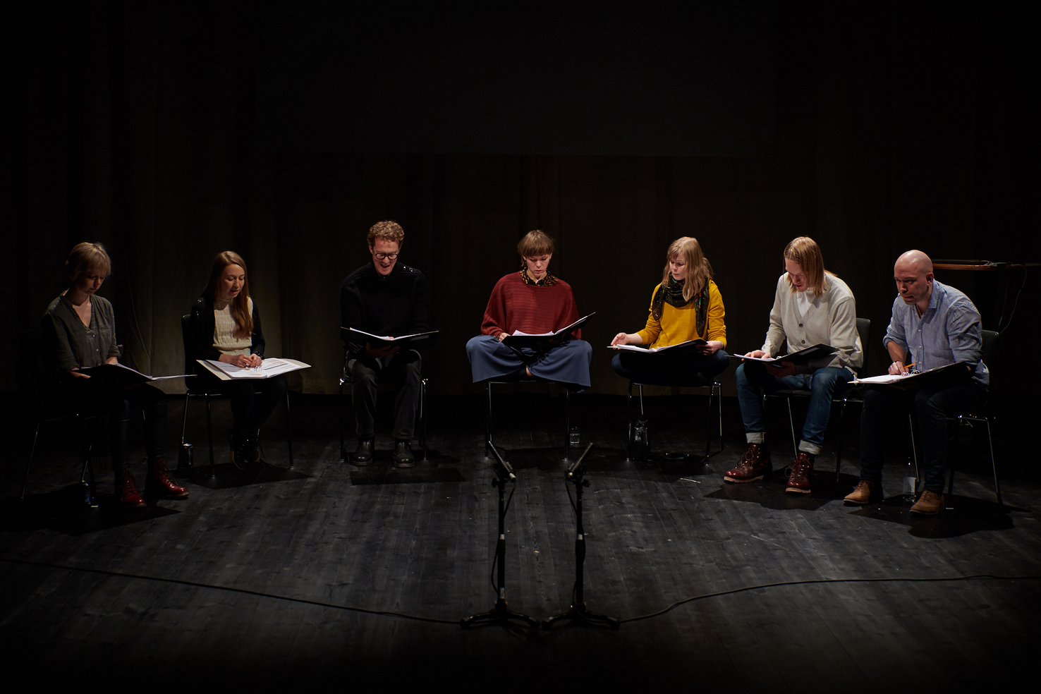 UD-chefen in med UD-kören som följe, de bär pannlampor och mumlar fragment ur dokument rörande Kaarle.