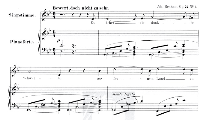 Interestingly, Brahms uses this type of notation in one of his songs from Op. 72 (ca. 1877). To make clear to any pianist what is desired, he first uses the French notation to show the prolonged touch. But after two bars of this pattern, Brahms changes it to the simplified version of the notation with a long, initial bass note, a slur, and the instructions of simile legato.