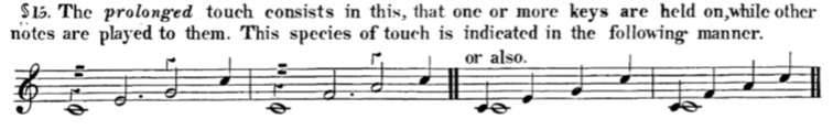 Czerny is the only source found so far that shows the long note at the start of an arpeggiated chord to indicate the use of the prolonged touch. He shows this as an alternative notation compared to the French style. Despite this notation appearing second, it is actually the notation that he uses most to ask for the prolonged touch, both in his Op. 500 treatise and in other works examined. This may be just short-hand for the French style that uses only a long note to bind the chord tones together rather than with ties. The long note can also be thought of as the beginning and end of a slur which is another way of notating the prolonged touch. Interestingly, the German edition of this work also has a slur over the second part of the example.
