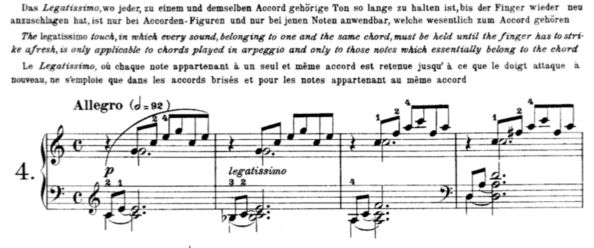 This notation appears in strong connection with Legatissimo and Molto Legato in Czerny’s didactic works, including Op. 500. As previously stated, Legatissimo and Molto Legato are defined as “very connected; nearly approaching to the prolonged touch” by Czerny.2 While it is not identical in this definition, an earlier definition by Czerny matches older definitions of the prolonged touch perfectly. In Op. 335, “School of Legato and Staccato,” Czerny describes many different types of touch. The prolonged touch term is not used but legatissimo is. Czerny states at the beginning of etude number four: “The legatissimo touch, in which every sound beginning to one and the same chord, must be held until the finger has to strike afresh, is only applicable to chords played in arpeggio and only to those notes which essentially belong to the chord.”3 This etude then summarizes all of the types of notation that have been given so far and uses the work legatissimo in the score. It demonstrates a cleaner French style in many places. The slur is present on the right hand part in many places that are not phrasing markings. And the long initial not is present throughout the etude and is the most prevalent of the three notations.