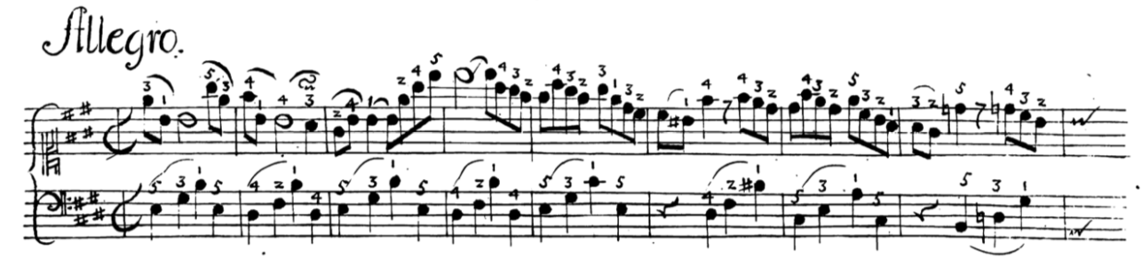 However, this touch is demonstrated to be used in faster speeds, too. C. P. E. Bach’s first lesson that he uses to demonstrate the prolonged touch is an allegro. Czerny in his Op. 335 first demonstrates the legatissimo touch with an allegro piece as well. Not only this but Czerny specifically states in his Op. 500 treatise that quick arpeggio chords that are not in a brilliant style but that “enliven and [i]ncrease the effect of full harmony” can have the prolonged touch applied.12 The brilliant style of execution according to Czerny is”[i]n a peculiarly clear, and marked, as well as energetic manner of touching or attaching the keys; by which the tone comes out with striking distinctness.”13 This is quite the opposite of a legato style of playing, making the prolonged touch certainly not a part of the brilliant style.