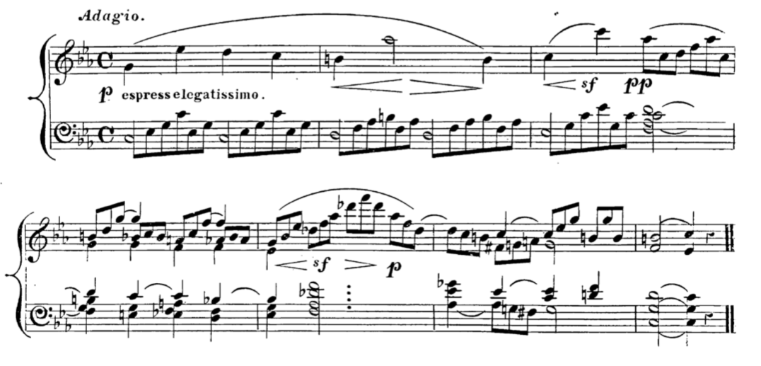 Czerny, in his discussion of the legatissimo touch, gives an example where the opening left hand is notated to require the prolonged touch. With this example, Czerny also provides additional details of where the legatissimo touch is to be employed. He states that it can be used in a “richly sounding succession of harmony.”6