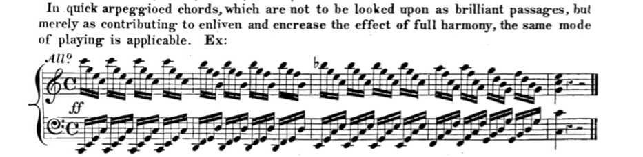 Within this last statement, Milchmeyer states that the tone becomes softer with the use of the prolonged touch. This is most likely related to the hiding of the attack of each note within the previous sound. However Czerny also example states that in his in his legatissimo example and says that prolonged touch passages “are generally played pp, p, or m.f.; seldom forte or ff.”10 This of course aligns with his example.
