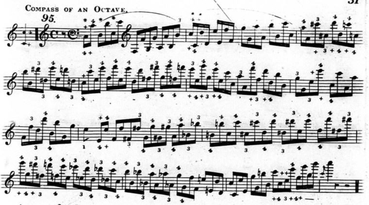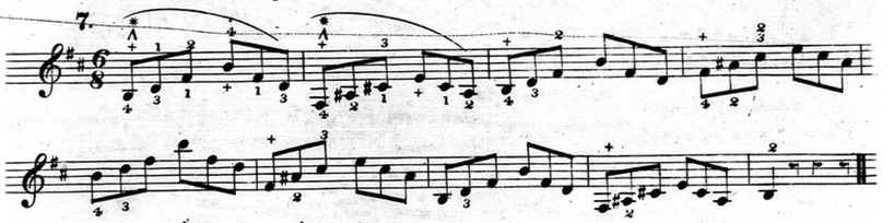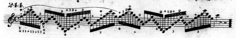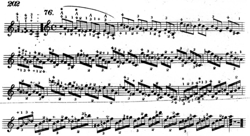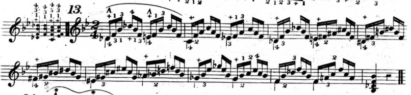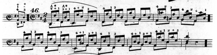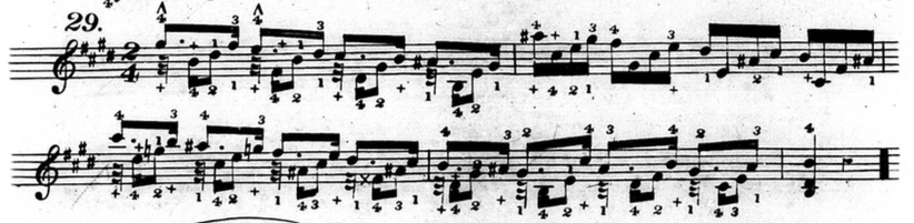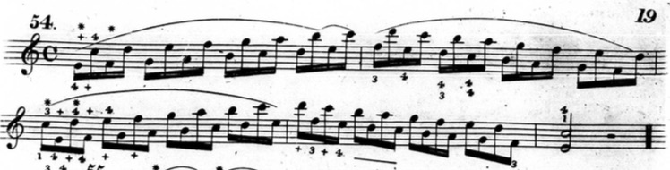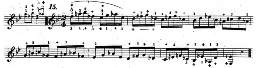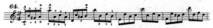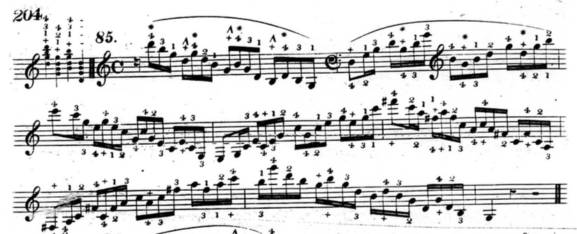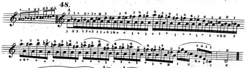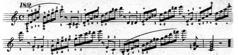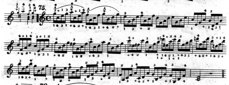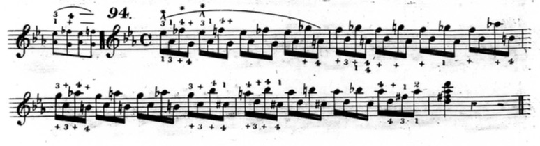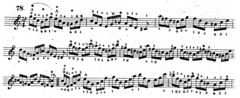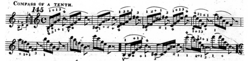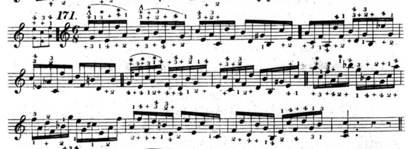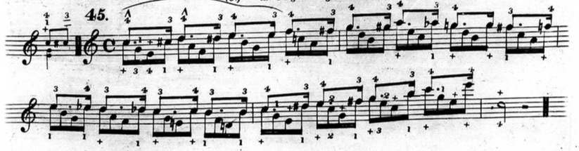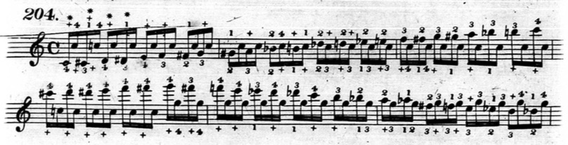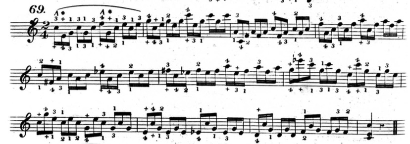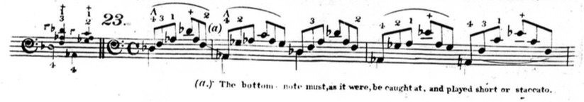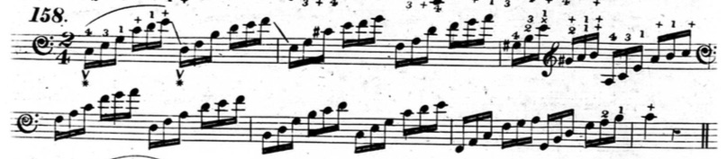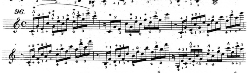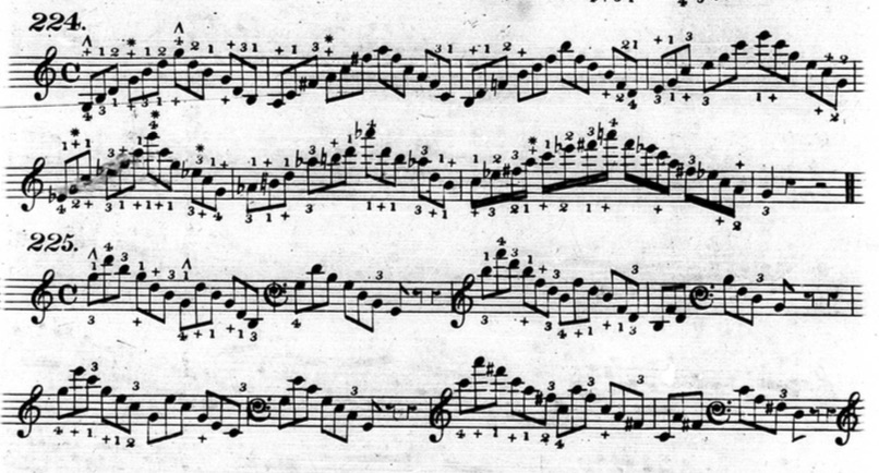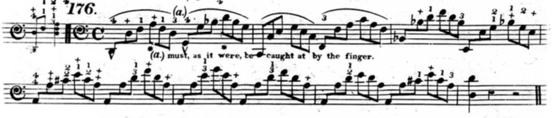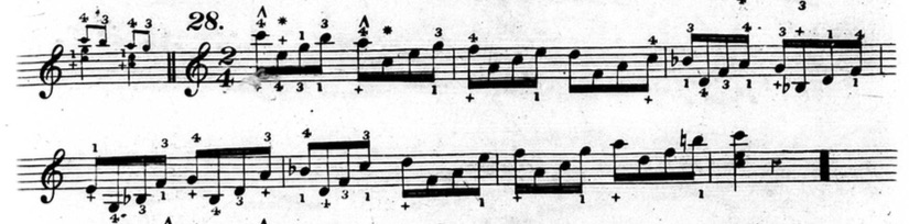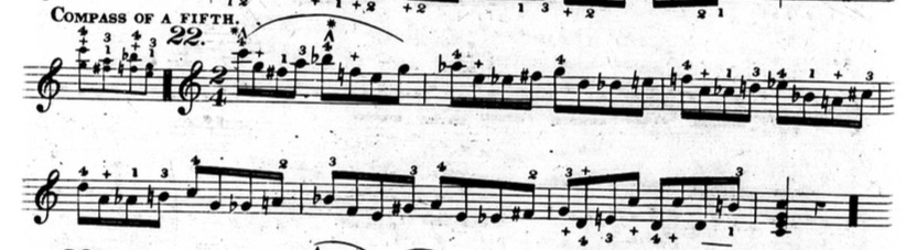 Furthermore, in plenty of exercises, he indicates that fingers other than the thumb or little finger should be held down. This deviates from his seemingly rigid rules and In the following example from chapter two (figure 3.3.13), beats three and four of the first measure are already using fingers other than the thumb and little finger to hold down notes.