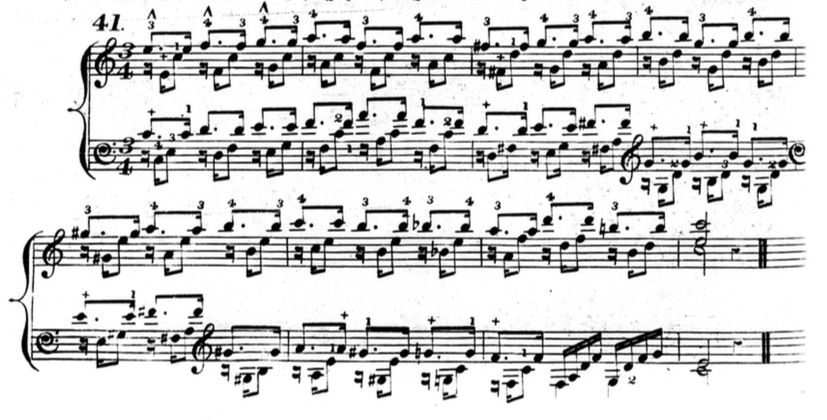 In the next example (figure 3.3.30), Hummel notates a star on the first note of each beat to indicate that it is held. The articulation is also legato and the chords before the first measure clarify the harmonic and melodic nature of the exercise. Hummel is calling for the prolonged touch to create a musical line.