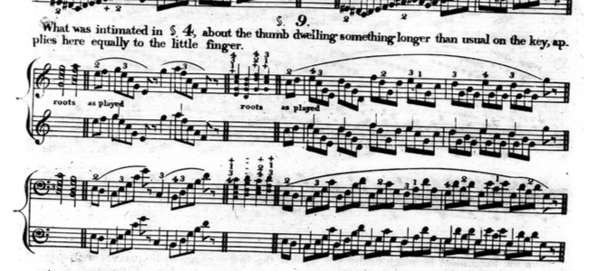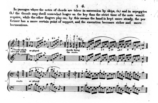 Part two of Hummel’s “Art of Playing the Piano Forte” focuses on practical exercises to acquire the “correct and appropriate application of the fingers of both hands.” He is also very focused on making his system of fingering applicable to the demands of the way the piano was being played in the 1820s. His exercises are divided into ten chapters that total around a thousand exercises. There is a great variety with regard to the types of exercises and on whether it is of a musical or simply technical nature. These exercises contain many suggestions as to the use of legato and the prolonged touch in either of the functions so far discussed. Examined in the following sections is Hummel’s use of the prolonged touch, or at least something very close to it, to achieve a greater technical stability and a greater richness in sonority.