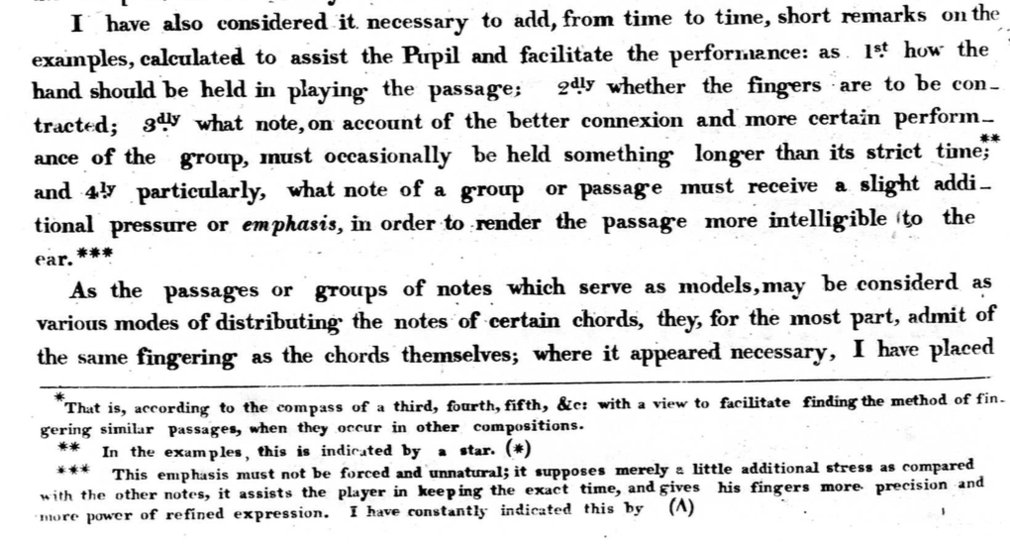 In his introduction to these exercises, he states four remarks that he will be making at times in the subsequent exercises. The third remark is of particular interest with regard to the prolonged touch: "what note, on account of the better connexion[sic] and more certain performance of the group, must occasionally be held something longer than its strict time.” This instruction he states will be indicated by a star. The definition that a note is held longer than its notated length fits the prolonged touch. However, much of what Hummel notates, especially in the first chapter of exercises, is not really the prolonged touch, but rather to make sure the execution of a passage with an interval is legato. Certainly holding the note longer to connect it to the following material will make a legato and give the pianist a more confident hand position. Larger intervals on Hummel’s instrument really do need this extra effort to produce legato. But this is not the idea of the prolonged touch that has been dealt with or established in this research.