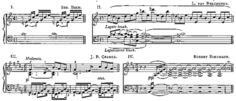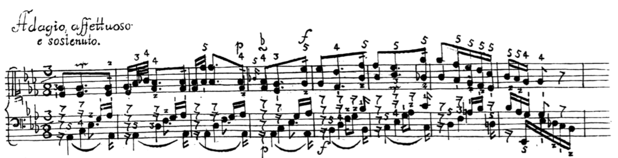When the prolonged touch is notated in the so-called French style, today, it is easily recognizable as calling for this specific technique. This is due to the explicit notation of each note to last until the end of the the chord by means of using many different note values and ties to get the exact correct length. This type of notation is today’s standard for instructing a performer to use the prolonged touch. It was certainly used throughout and beyond the Classical and Romantic periods. Examples of this notation can be found in C. P. E. Bach, Beethoven, J. B. Cramer, R. Schumann, Moscheles, F. Chopin, and many more. Additionally, this style of notation often used in literature to explain the prolonged touch if another notational system is used. This has to be due to the unambiguous and self-explanatory nature of the notation.