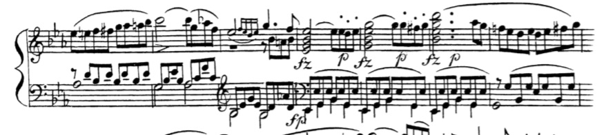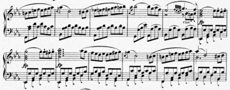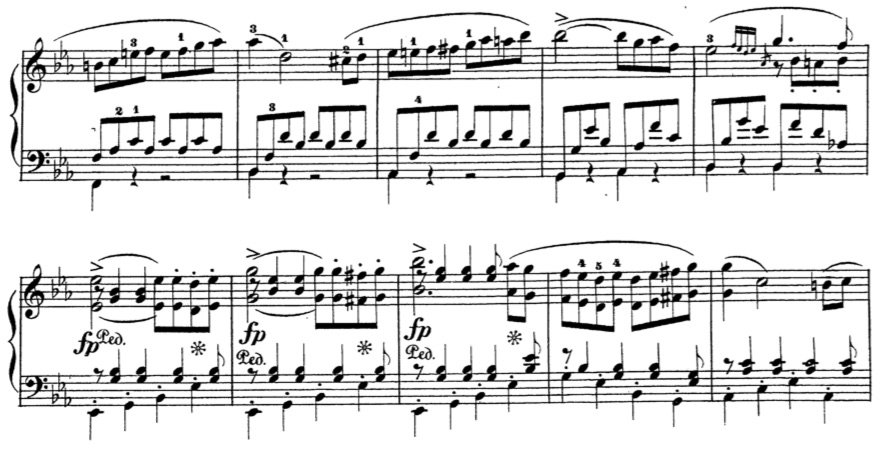 Next is a Septet, Op. 20 arrangement for solo piano by Friedrich Hermann from ca. 1853. The most important thing to note is that the leaps in mm. are too large for just the hand so the pedal must be used. Refer back to figure 1.2 and notice how those leaps are possible within the hand’s normal span.