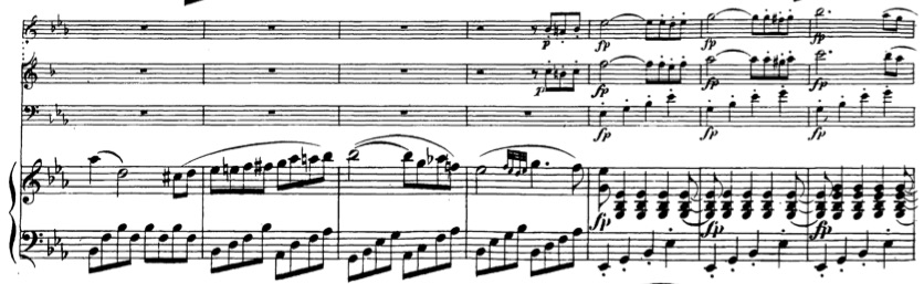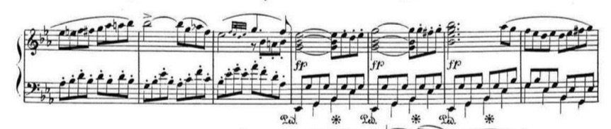 The second factor is the development of the pedal technique. The use of the sustain pedal was becoming more and more sophisticated in the early Romantic period. The later pedal technique allowed pianists to do more leaps while sustaining the sound. Therefore, the sound could be richer without the hands needing to sustain chords like the case is with the prolonged touch. A clear example of this occurs with arrangements of Beethoven’s Septet, Op. 20. Beethoven himself made an arrangement in 1803 for piano trio of this work. In it, there are many passages that could have the prolonged touch applied. This is especially true because the range of some of these chords does not extend beyond an octave.
