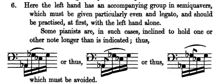 The last major factor in the decline of the prolonged touch usage was a combination of reading a score too literally and losing the understood notational conventions for the technique. If the score is read in a very modern sense, only one of the three notations for the prolonged touch will likely be recognized, and by no means is that one way necessarily the most popular. This change in mentality, especially with regard to the this technique, can be seen already in Carl Engel’s The Pianist’s Handbook from 1853.