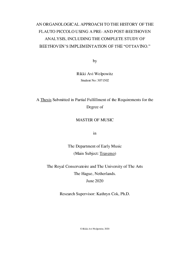 The organological development of the piccolo was studied using three primary roles assigned for compositional evolutionary analysis: [1] an expander of range and dynamics, [2] its programmatic effects, and [3] an instrument’s primary role in a solo arrangement. Before Beethoven, only the first and second of these primary orchestral roles for the piccolo were established.