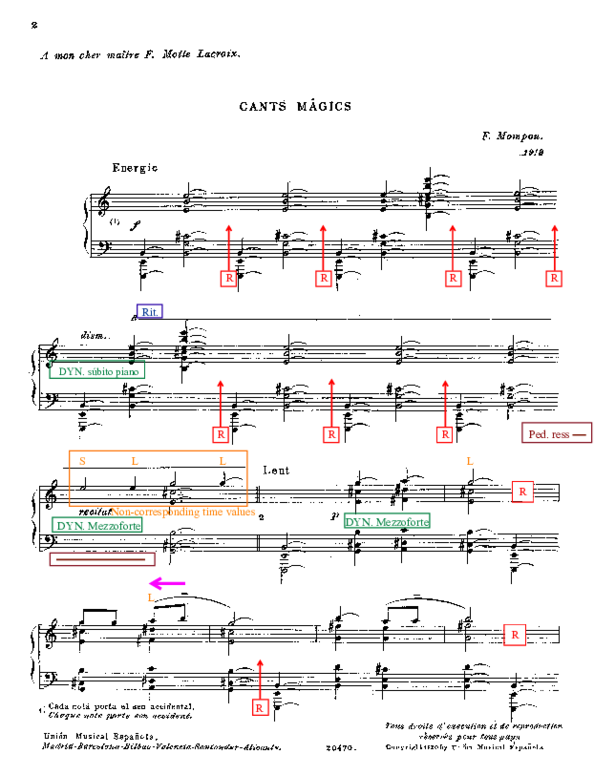 Frederic Mompou i Dencausse (1893 - 1987) was one of the most intriguing Spanish composers of the 20th century. His music, often described as pure for its beauty and apparent simplicity, has captivated the attention of numerous critics and musicians around the world. The majority of the production of Mompou is dedicated to the piano, instrument that he mastered despite his reluctance to perform for large audiences - similarly to F. Chopin. The aim of this research is precisely to investigate the way Mompou performed his pieces, in other words, his performance style. My investigation is divided into two clear sections: on the one hand, chapters one and two provide the reader with a theoretical framework (biography, style, and influences; on the other hand, chapters three and four constitute the practical and most important part of my research. Concerning this last one, I analyze Cants Magics (1919), the first piece that presents a defined unique style, and its corresponding recording performed by Mompou himself in 1974. The result of this proces is the creation of a new annotated score to visually demonstrate the different expressive resources he uses to enhance the expression of his composition. Examples of these are dislocations, tempo fluctuations, voicings, rubati and pedalling. Lastly, in chapter four I apply partof the above-mentioned Mompou's pianistic techniques into other compositions from Musica Callada. These serve me to formulate an experienced-based reflection on the matter.