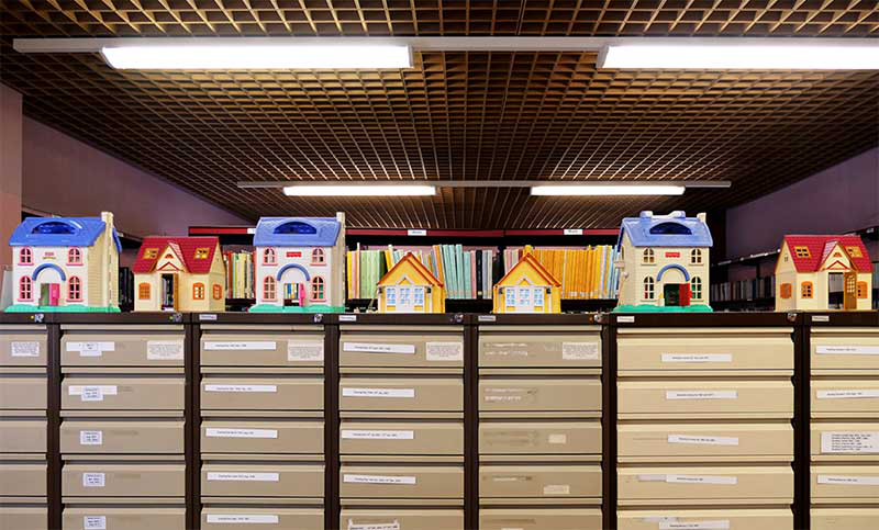 ‘Ghislaine Leung, Public Sculpture, 2018. Toy Catalog Items, laminated and paper labels, rubber bands. The support of a "service" takes shape in the work Public Sculpture (2018), commissioned by Reading International for Reading Library. To obtain this piece, Fri Art was asked to activate the loan system introduced by Ghislaine Leung (*1980, London) with the library in Reading, England. Public Sculpture's toys, purchased by the artist for this commission, exist in two borrowing terms, depending on whether they are loaned individually by the library, and according to whether they are borrowed to incorporate an art exhibition. They thus retain a dual status, and assume both the attributes of a library loan and that of an exhibition; borrowed, packaged, transported, insured, exhibited, listed, titled. The development of this complex mechanism is at the heart of this work. At the end of the exhibition, the objects return to the library and are available for a new loan.’ [55]