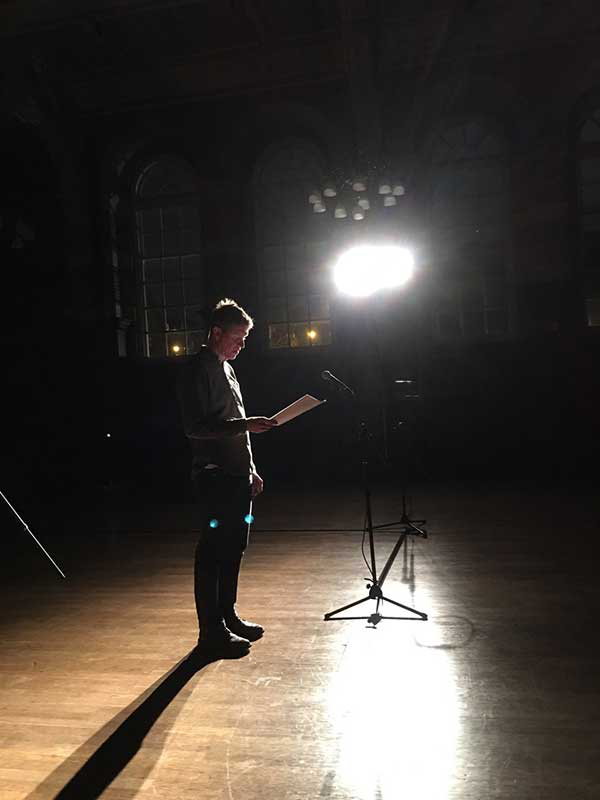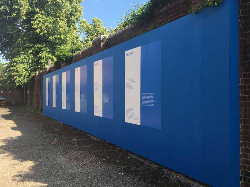 This historical scenario was used as the catalyst for the year-long interdisciplinary curatorial project, ‘A reproduction of three weeks in May 1970’[38] organised by the itinerant curatorial and publishing platform NOVEL (Alun Rowlands and Matt Williams) who sought to activate the historical scenario as a platform for discussion and reflection, connecting the spaces of the university with public spaces of display, thereby disseminating narratives around different kinds of fiction and art writing. NOVEL uses its publishing methodology for an array of editorial and curatorial projects, publishing artists’ writing and texts that in their own words ‘oscillate between modes of fiction and poetry, thereby acting in-between the potential performance of a script, and the indeterminate transcript of the event’.[39] This curatorial methodology maps on the itinerant nature of Reading International, using its modes of dissemination and publishing as a bridge to link spaces between university and town, fictioning and re-activating a social, almost forgotten memory of the place. NOVEL’s project currently still evolves. On NOVEL’s invitation, Düsseldorf-based artist, curator and publishing collective Studio for Propositional Cinema (SPC) produced a series of Public Notices, displayed as billboard posters and posted on three extensive empty hoarding sites in Reading. The script/text describes a libretto for a five-dimensional dystopian opera set in a society in which all forms of language and interpersonal communication have been mitigated or eliminated. This script was then performed by an actor and interpreted as a musical score, which led to an organ recital by Swedish organist Hampus Lindwall, and was staged at the University of Reading’s Great Hall, which is located at the London Road Campus, close to the site where Rita Donagh’s experiment had originally taken place. Each of the six songs of the libretto represents the desperate attempts of the protagonists to relearn various forms of communication. The recital was performed to an audience of students, academics, local artists, external visitors from London and Berlin, local organ enthusiasts and community members. This event was in turn interpreted by students and the local community. A group of theatre students sought permission to use SPC’s text works as a script for their own experimental theatre project, which they developed for their performance exam. The billboard project and performance event was then reviewed by a local community blogger, who wrestled with the experimental nature of the work, but nevertheless published a personal, humorous interpretation of the event. The artist’s Berlin based gallery then promoted the work and produce a 14” record for their next international exhibition.