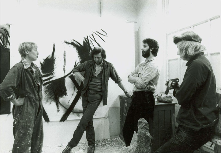 At the same time not far away in the Department of Art at the University of Reading, students were maybe less radical but were also developing a growing interest in new and critical formats, such as ‘happenings’, music, pop and fashion, and were thereby aiming to be at ‘the furthest frontiers of the musical and performative avant-garde’ as Michael Bracewell describes it in his book on Roxy Music. Some of the band members originated as art and music students in Reading and Winchester.[35] In May 1970 artist Rita Donagh who arrived from Newcastle, one of the pop cultural centres of the time, and a group of students, occupied a studio at the University of Reading. Staging events, performances and collective actions, they wrote and discussed circumstances within and beyond the confines of the university. Didactic conventions and context were replaced in an attempt to diagram a charged collective knowledge. Activated against a backdrop of student protest, in particular the Kent State massacre, the group sounded political images, registered distance and invested in a politics of time, place and bodies.[36] (Some of the student participants then developed careers as artists and musicians, such as the pop and punk band ‘The Moodies’.) Donagh’s own response, the painting ‘Reflection on Three Weeks in May 1970′ uses a social-political cartography to plot distinct events between image and experience. The painting ‘Reflection on Three Weeks in May 1970’ is now held at Tate Britain.[37]