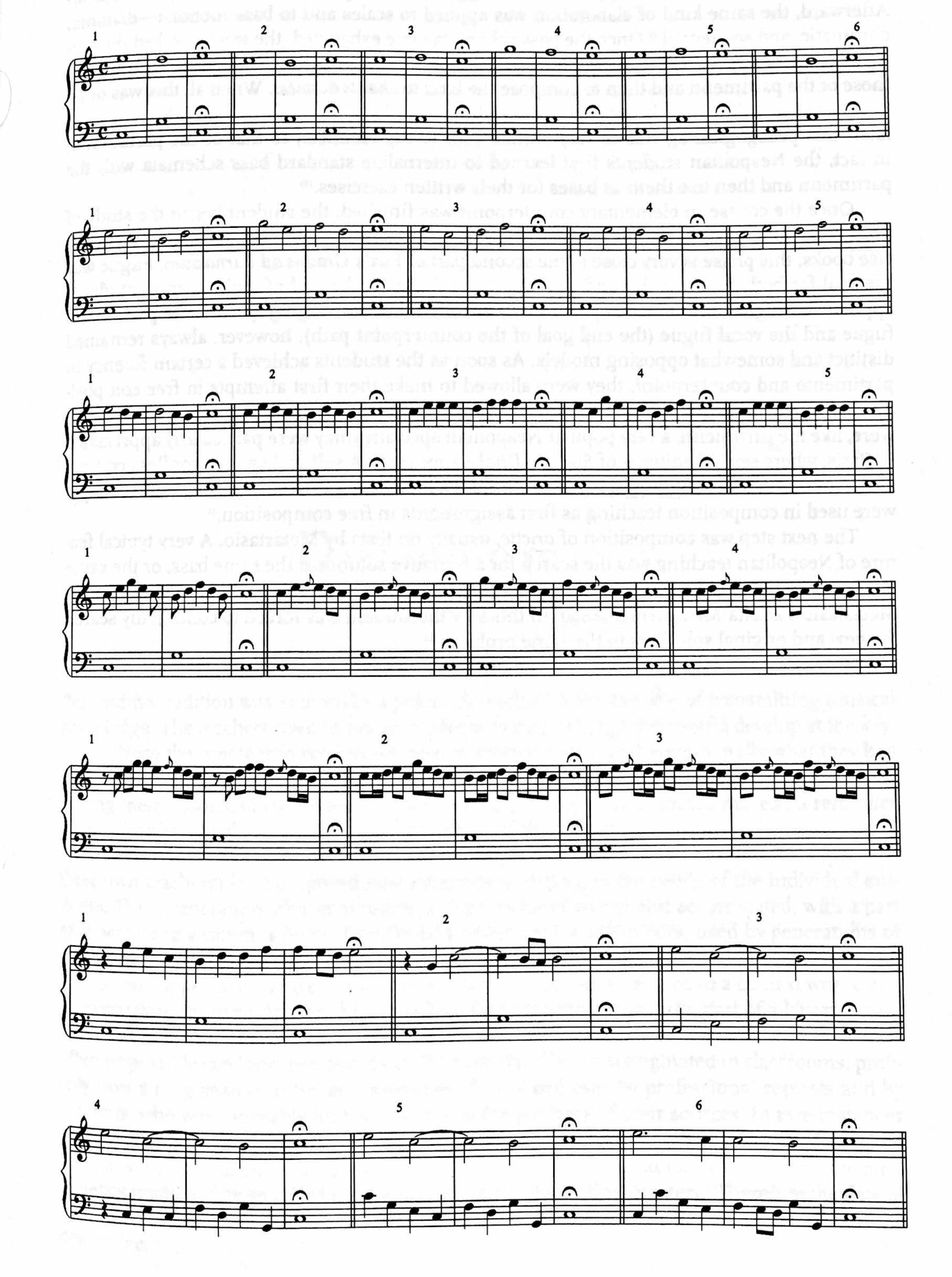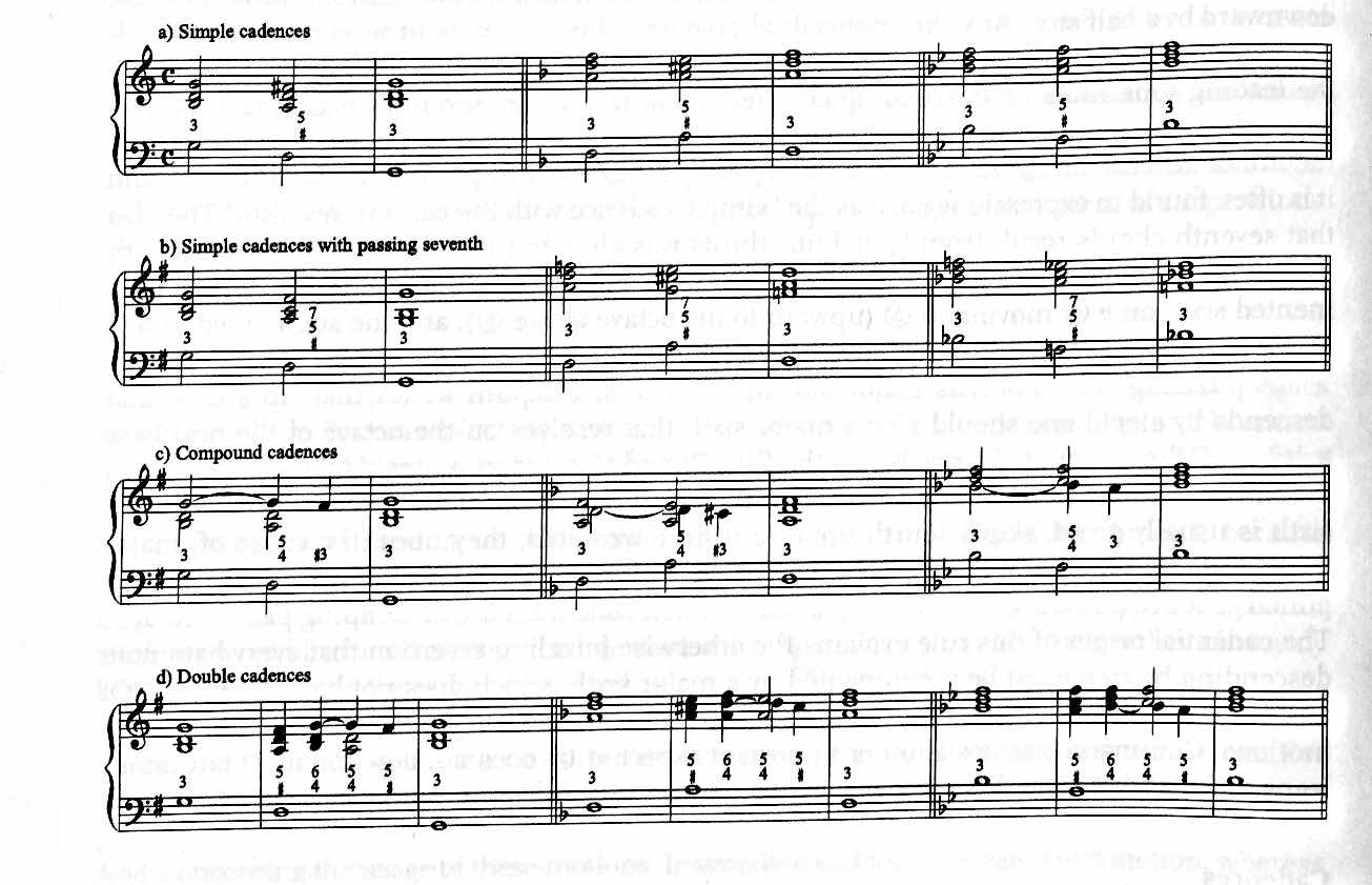There exists three kinds of cadences, the semplice (simple), composta (compound), and the doppia (double), demonstrated in Figure 3. As you can see, the cadenza semplice dominant has only one metrical unit; the cadenza composta has two metrical units on the dominant, creating 4-3 suspension on the V; and the cadenza doppia has four metrical units on the dominant, creating the following progression on the V: