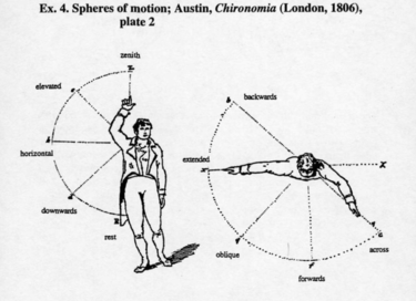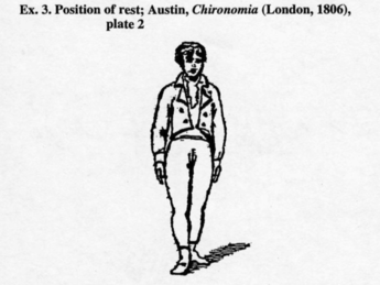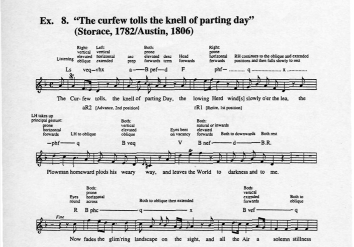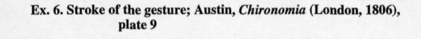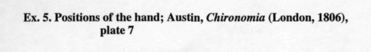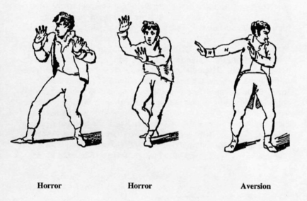 Regarding the 18th and 19th century, the findings of Gilbert Austin (1753-1837) in his book on Cheronomia* (1806) provide a clear overview of how gestures should be used in a correct way to improve verbal persuasion. Despite the fact that theatrical singers employ a more passionate or stronger form of action, he is nonetheless convinced that both oratorical and theatrical singers move their audiences by using a common set of gestures. In singing, action encloses all the movements we can observe in the body. This also includes the position of the feet. In those days it was suggested that singers should place their bodyweight on one leg, allowing the other limb to stay relaxed so that it was prepared for an immediate change to occur. This caused a continuous movement in which the bodyweight shifted from one leg to the other. Furthermore, Austin stated that the hands and arms are making motions in a vertical and horizontal direction (see exposition 4) from the position of rest (see exposition 3). These motions are created with common hand positions (see exposition 5). The raised hand(s) performs the principal gesture, whereas the retired hand(s) performs a replica of this gesture with much less energy (see exposition 6). Whether one or both arms are raised, expressing the intensity of a gesture depends on how strong the emotion is. Transitions of hand gestures should be created with ease and simplicity and not contain any form of rigidness. Also, the motions should be appropriate for the right emotional atmosphere, which means that e.g. sudden movements are only appropriate when the intensity of the emotion asks for a rapid expression. Horror and aversion are emotions for which this rapid change of motion could be of use to amplify their urgent message (see exposition 7). The audience expected differing gestures from the singer. The gesture should be slightly different than the one(s) previously made when repetitions of words occurred. Austin described these hand gestures, positions of feet and even correct facial expressions into four texts, of which have I added one (see exposition 8), serving as an example of his system. Until today there are individuals who claim that a gesture has to be found which corresponds with the emotional message that is conveyed. [4][14]