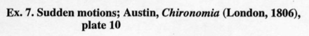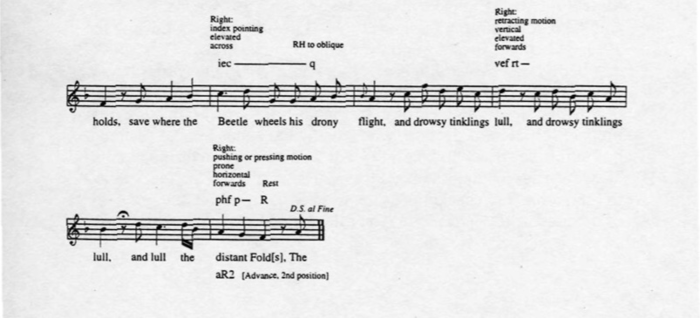 Above the staff Austin notated the symbols for the movements of the arms and hand an their belonging expression.