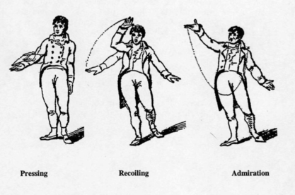 “To raise the hands higher than the head, to strike fists together or one hand inside the other, to put the two fists on one's sides, to point with fingers, to spread them apart, to stretch out and cross the arms, to gesture too much, to gesture with regular action (which is called to gesticulate), and to gesture first with one hand then the other alternatively—these are all vicious gestures which will not be put up with on the tragic stage, and which can be suitable only to comedy, and which, consequently, cannot be accepted in a serious orator.” [2]