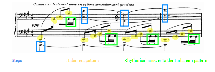 At Tres Rythme passage, in the second recording, the sixteenth notes sound much more flexible than before. This applies to the melody, but also to the Habanera Rhythm. Furthermore, working with the dancer made this passage slower. It is possible that the irregularity is the same in both versions. However, the slowest tempo remarks this irregularity, and sounds more expressive than before.