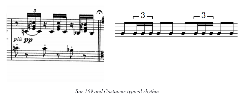 At bar 109, the composer uses a rhythm based on Spanish folklore. When I was explaining this rhythm pattern to the dancer, I emphasized more the first beat of every bar. This explanation affected my playing, as the next videos show. I was not aware of this change before listening the recordings, and for that reason, this is an Organic Variation.