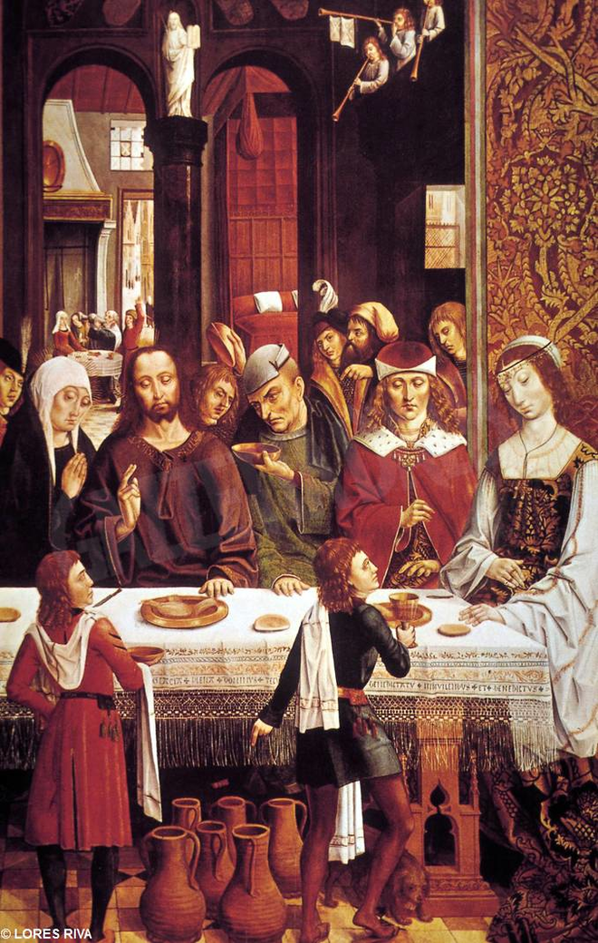 5 Due to the widespread influence of northern art in Castile, the extensive borrowings from the Masters of Netherlandish art do not necessarily lead us to suppose that he had lived outside Spain. For a long time attributed to Fernando Gallego (ca. 1440–1507), the altarpiece is assumed today to have been created by a follower of the Salamancan master, whose origins and nationality remain uncertain. Nevertheless, the high quality of the paintings attributed to the Master and the likely patronage of the Catholic Kings leave no doubts the fact that he was an important artist. Ferdinand and Isabel apparently commissioned also the retable “The Marriage at Cana”, where the prominent display of their heraldic devices and those of Maximilian I was probably meant to commemorate the marriage of their younger daughter, Juana of Castile, to Philip the Fair, Maximilian’s son (September 1496), and that of their son, Juan of Castile, to Margaret of Austria, Maximilian’s daughter (April 1497).