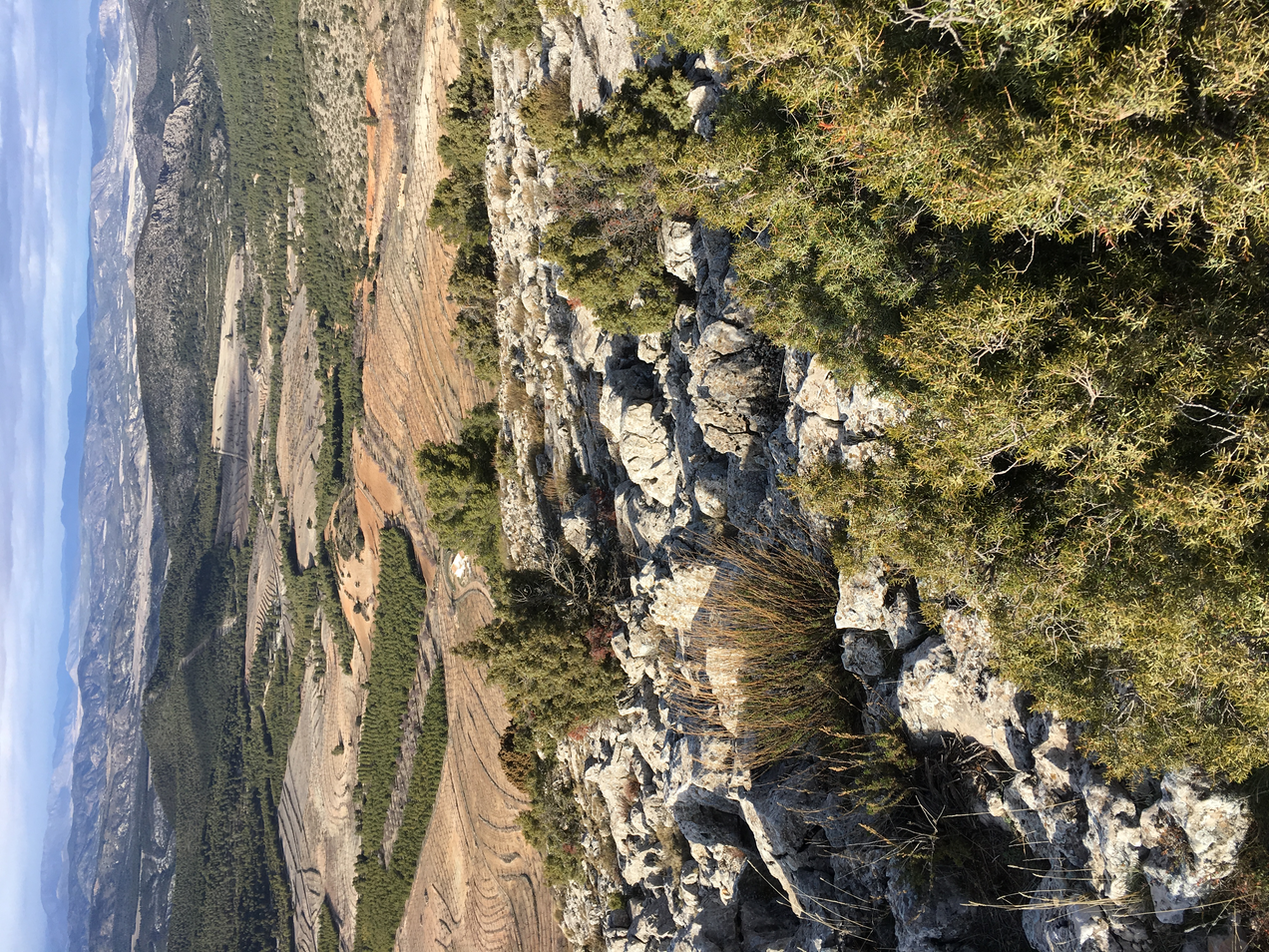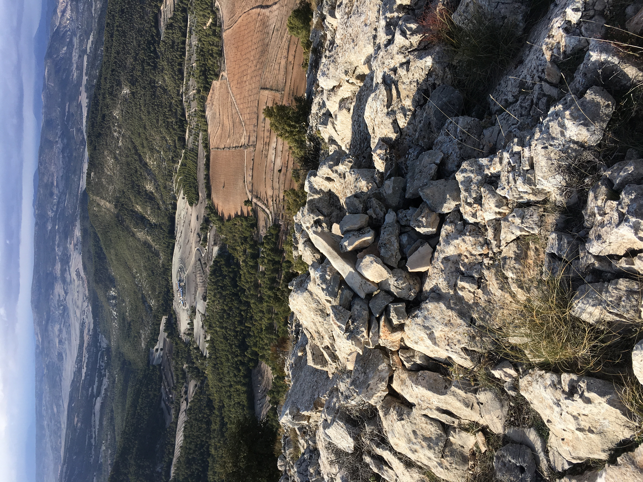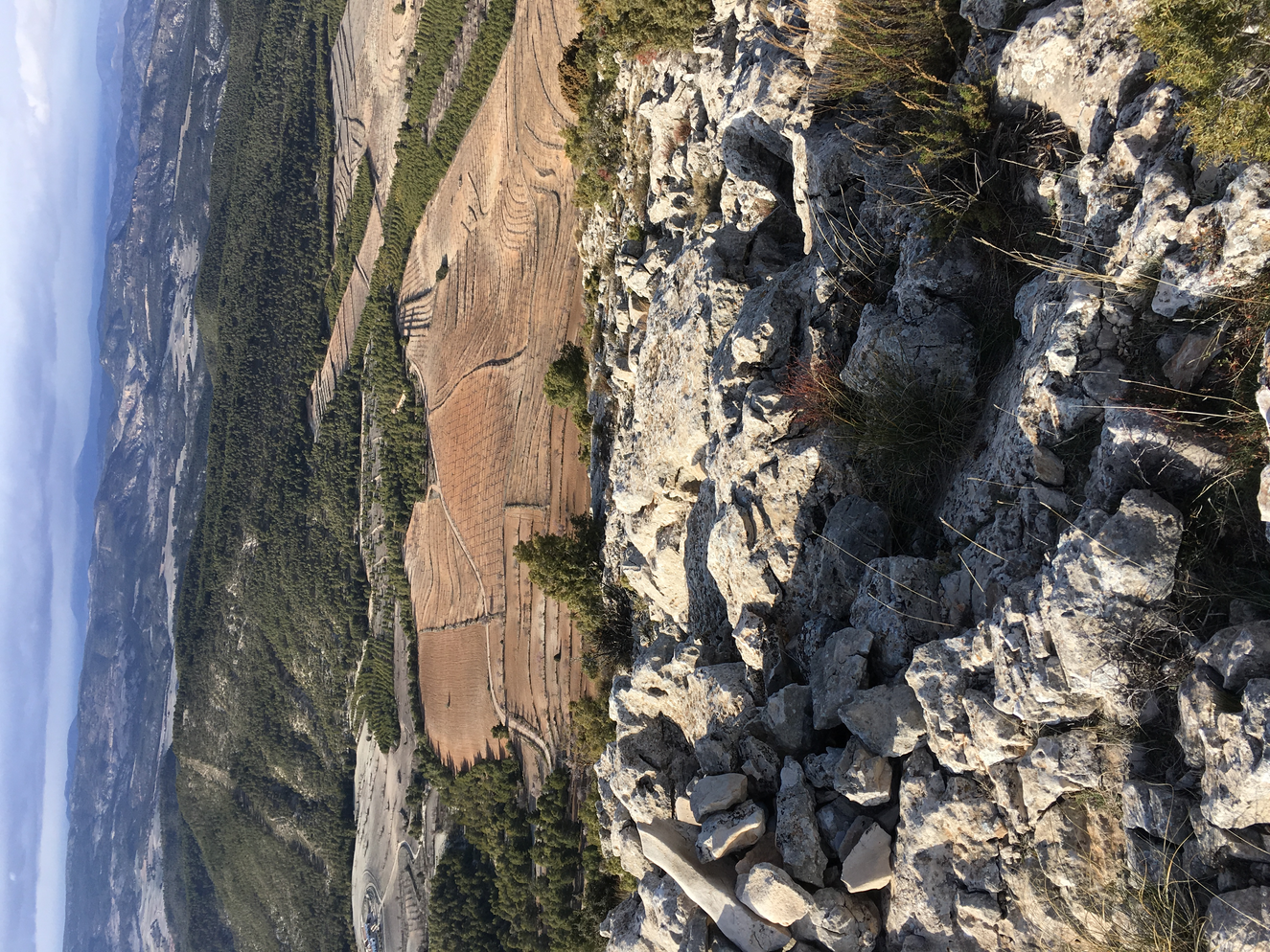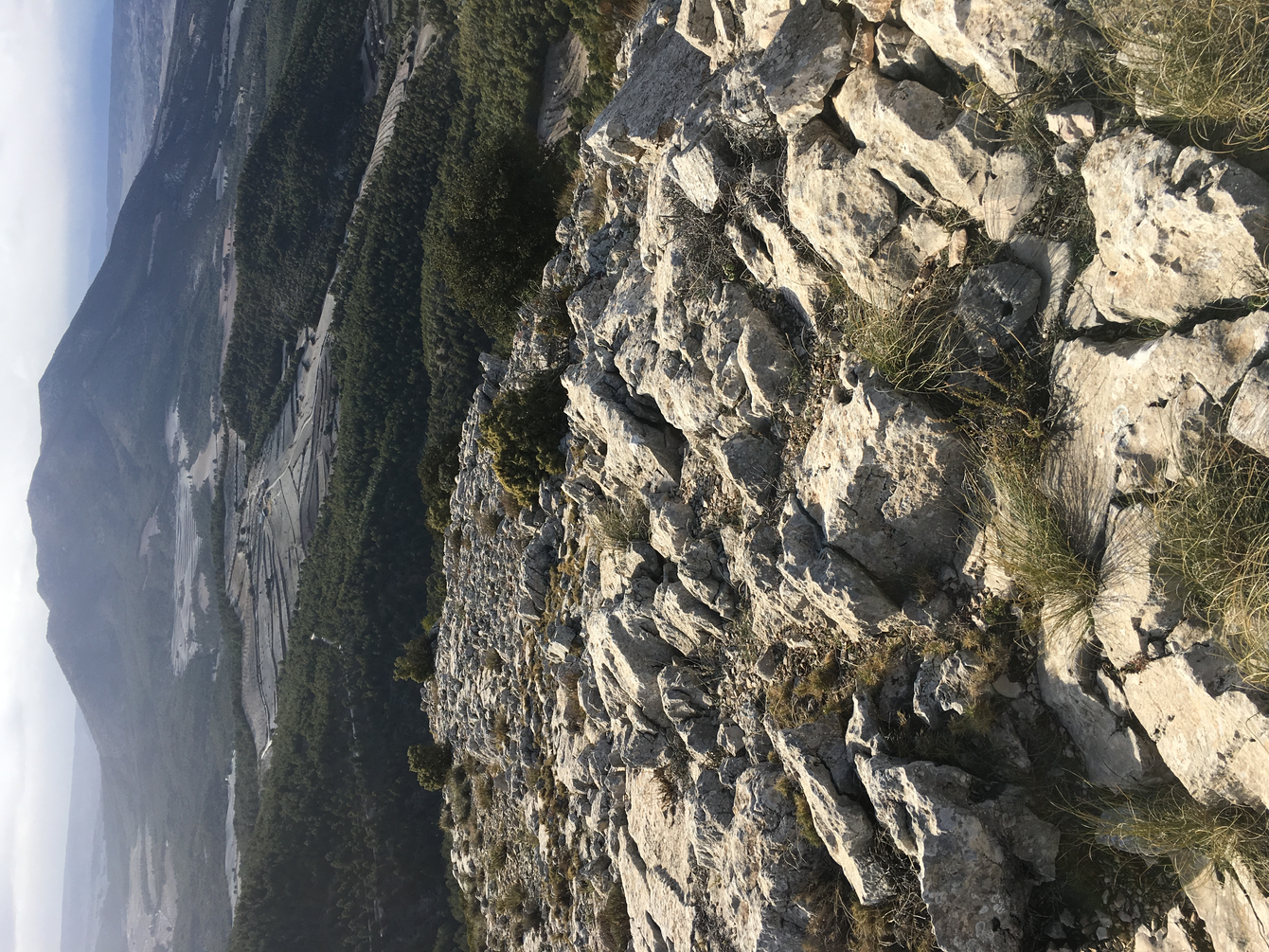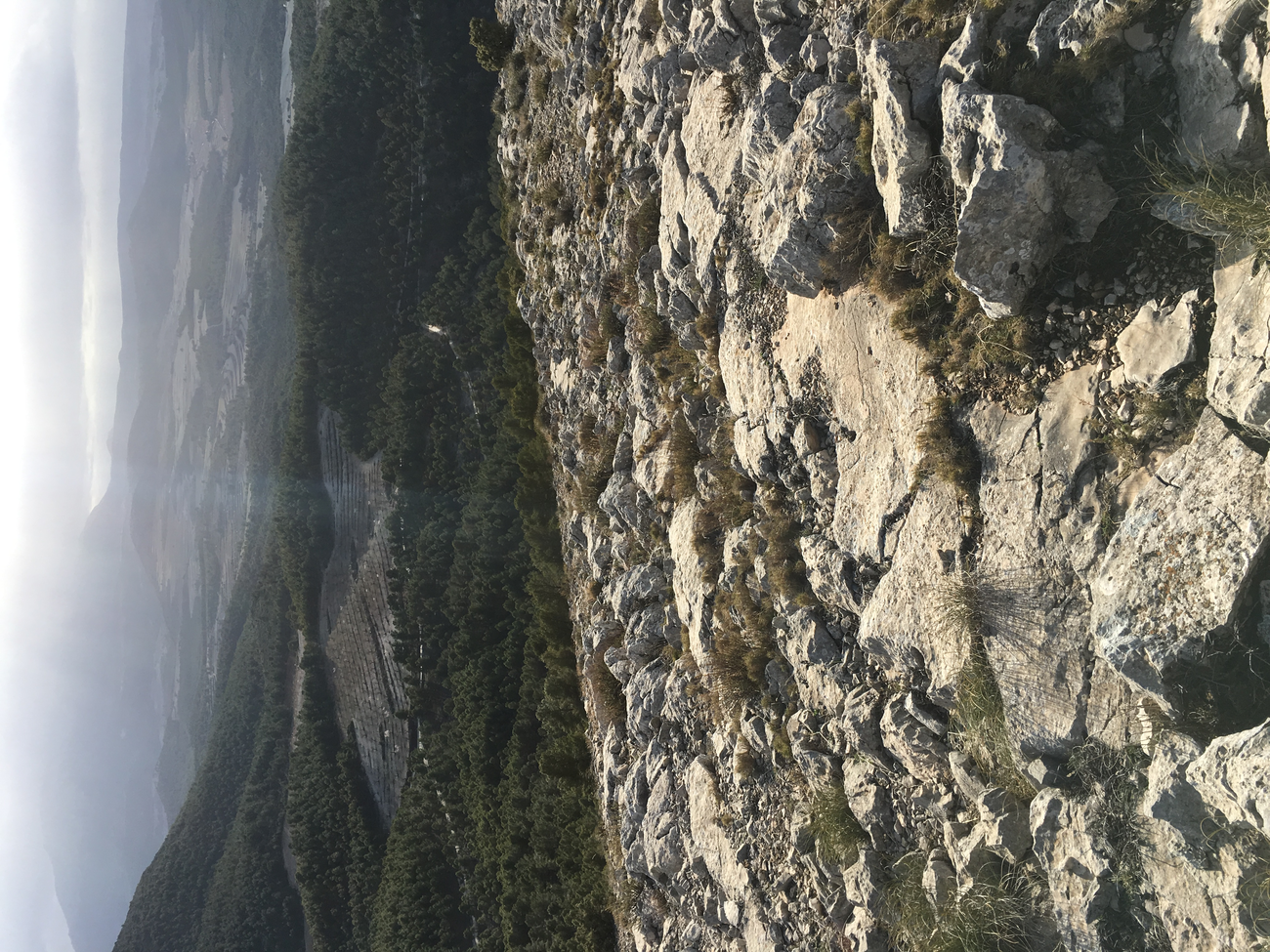 From the top of Sierra Larga María, the hill to the south of the farmhouse, I could see the Sierra Nevada was snow-capped, and partially hidden by cloud. I could also see that the cloud was moving in our direction. Using my phone, I took photos of the landscape below me. In the images, the ground appeared as a pixelated mass of homogenous grey-brown; the limestone soil had no discernible features. The granular earth appeared like noise or static on the phone screen. I captured the landscape to the east. As I panned around, clicking the shutter, the vista became increasingly engulfed in fog. North-westerly clouds swirled and began to obscure the view of the thousands of Aleppo pines that stretched across the valley. The lichen-covered limestone at my feet was marked by droplets of rain as I tried to capture the lunar-esque terrain. Images became blurred and undefined, as though taken through a smeared lens or degraded from compression or reduction.