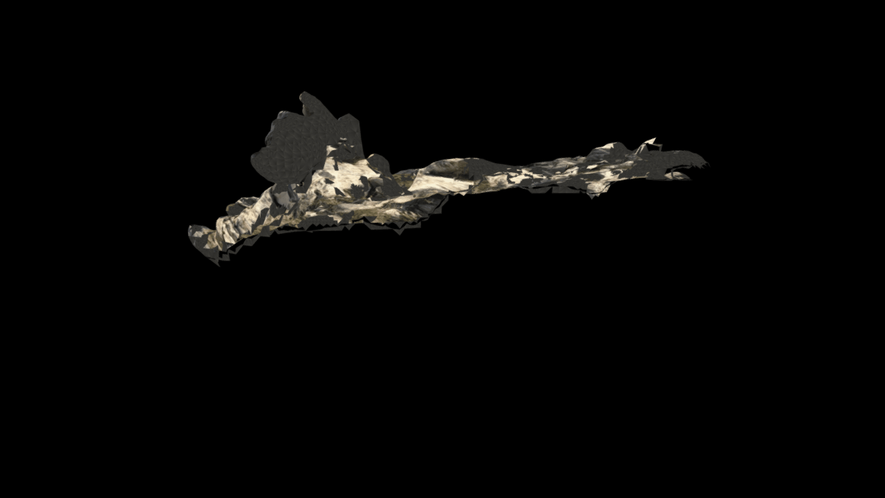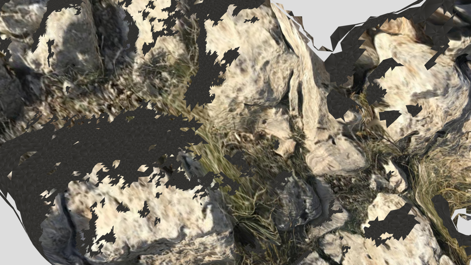 Clear rock forms are peppered with indistinct blank spaces, triangles of grey-black.