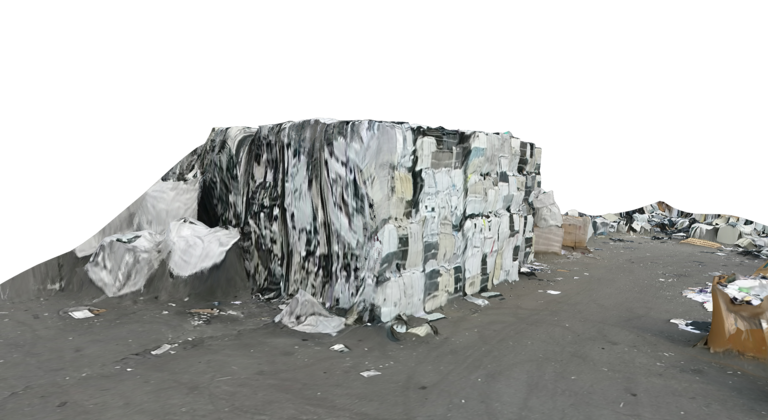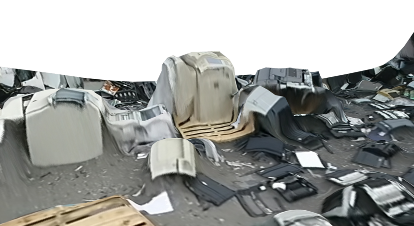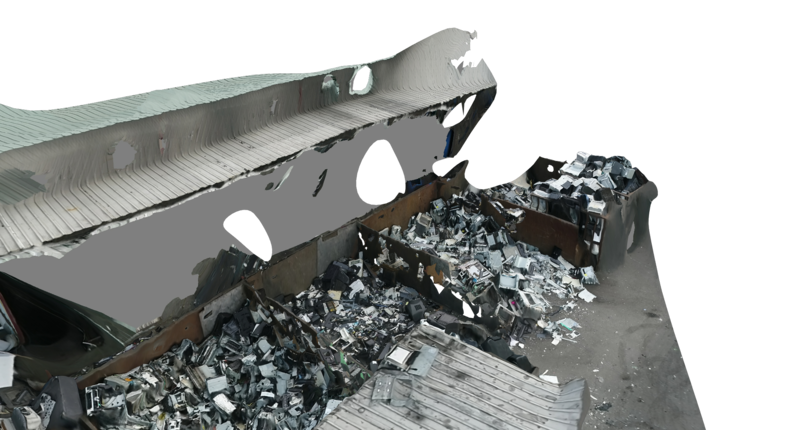 Created from drone footage, the hi-res clarity of the top view is augmented by a molten, smeariness when viewed from the side. The textures run down the side of monitors and printers discarded on the ground. Stacks of printers drip with texture down their sides.