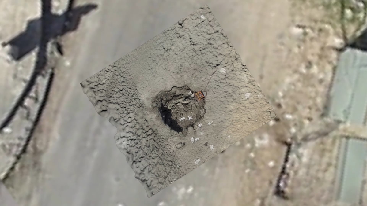 Close-up of photogrammetric model of the crater of chemical attack in Khan Sheikhoun. A crater in the center of the image was suspected to be that of a chemical bomb.