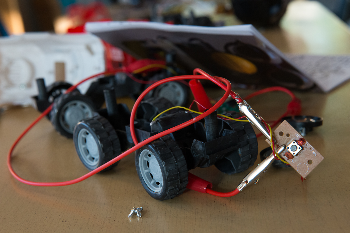 Image of 'circuit bent' toy car as part of Garnet Hertz's workshop 'Toy hacking'. An example of 'Zombie Media' in which obsolete tech is rewired and repurposed. Peter Huynh/ICS Communications