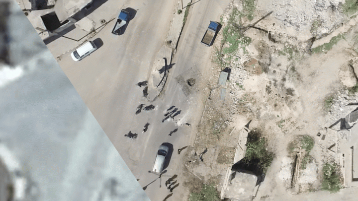 The scene of the chemical attack in Khan Sheikhoun. A crater in the center of the image was suspected to be that of a chemical bomb.