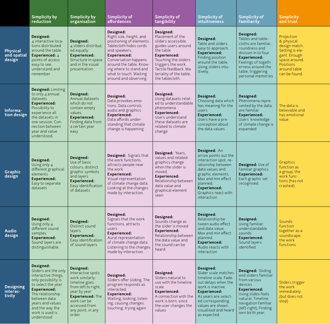 Working with the Qualities of Simplicity from a designerly perspective allowed me to combine the qualities to the idea of interactive art as a multi-sensorial and contextual entity. By conducting user observations made in St. Etienne and rethinking my work from a personal, heuristic point of view, I was able to collect information to a Simplicity Matrix. Looking at the interactive installation Climatable from various points of view different expressions of simplicity were found. Also research review was done, an email survey with young interactive artists was conducted and other artists’ interactive works were analysed along with my earlier works. The matrix building provess was an iterative process during which the Qualities of Simplicity were refined, examined and even discovered and abandoned.
