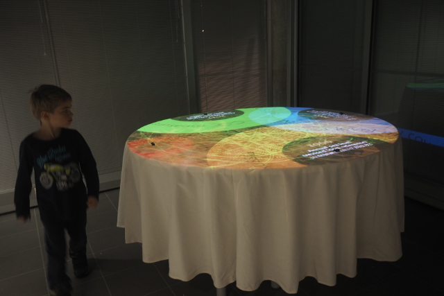 Early on in the research process, the doctoral dissertation was positioned as an artist-centred inquiry to the creative process of making interactive art. I spent quite a lot of time defining and analysing some of the key concepts in the field, such as interactivity and user interface. I positioned interactive art as a smaller subfield of media art, which in this research is sort of a mothership, containing other genres such as sound art, video art and even the ever-changing and unstable field of new media art. While new media art and interactive media art seek new platforms, genres, topics, technologies and types of engagement, they already have a history, a multitude of artworks with which new artworks can create a dialogue with. The interactive work Climatable (Picture 2) clearly is one embodiment of a “typical” media art work: a table with an image projected from above, which is interacted with simple actuators (linear sliders). Using a form which perhaps is familiar already from other contexts — not only from interactive art exhibitions but also from fairs, science centre exhibitions and even places like airports and shopping malls — can be also a way to achieve simplicity.