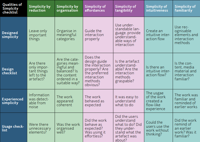 In the research Qualities of Simplicity in designing interactive art also a designers tools or checklist is presented, which I call the Simplicity Framework. It can be regarded as a generalised model of the Simplicity Matrix (Table 2). The Matrix and the Framework were born side by side during the iterative design -research process, both influencing each other: the practical notions made up for the matrix were generalised in the Framework, which in its turn helped to fill in potential gaps in the Matrix. The Simplicity Framework can be useful as a check-list when designing interactive artefacts before or during the design process — essentially a new Simplicity Matrix can then be populated with the findings. It is noteworthy to say, that true data from experienced simplicity can only be gained by designerly methods: observing, interviewing, conducting surveys etc. This can be seen in the Framework: the design checklist questions are in the present tense, while the experienced usage checklist questions are in the past tense.