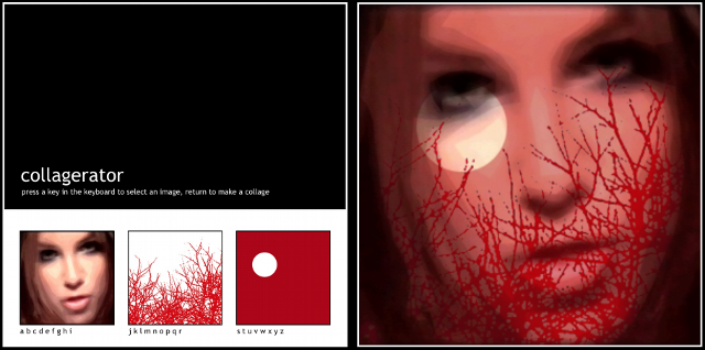 In 2000 I finished my master of arts final work Collagerator. It was a CD-ROM multimedia work which created collages, complete with a layered sound collage and the possibility to print the collages. The users selected images for three different layers from predefined image banks, pressed the return key and saw a collage of those images (Picture 1).