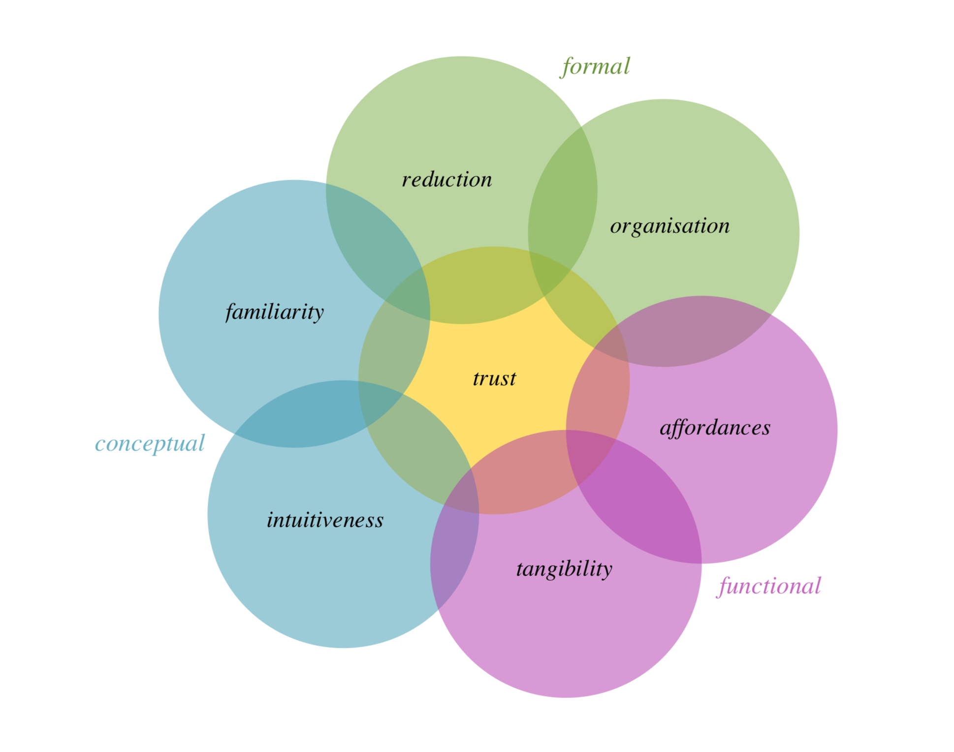 The Qualities of Simplicity as defined in this research are: reduction, organisation, affordances, tangibility, intuitiveness and familiarity. Together they build up trust towards the interactive artefact. The qualities can be futher grouped as formal, functional and conceptual qualities (Picture 3).