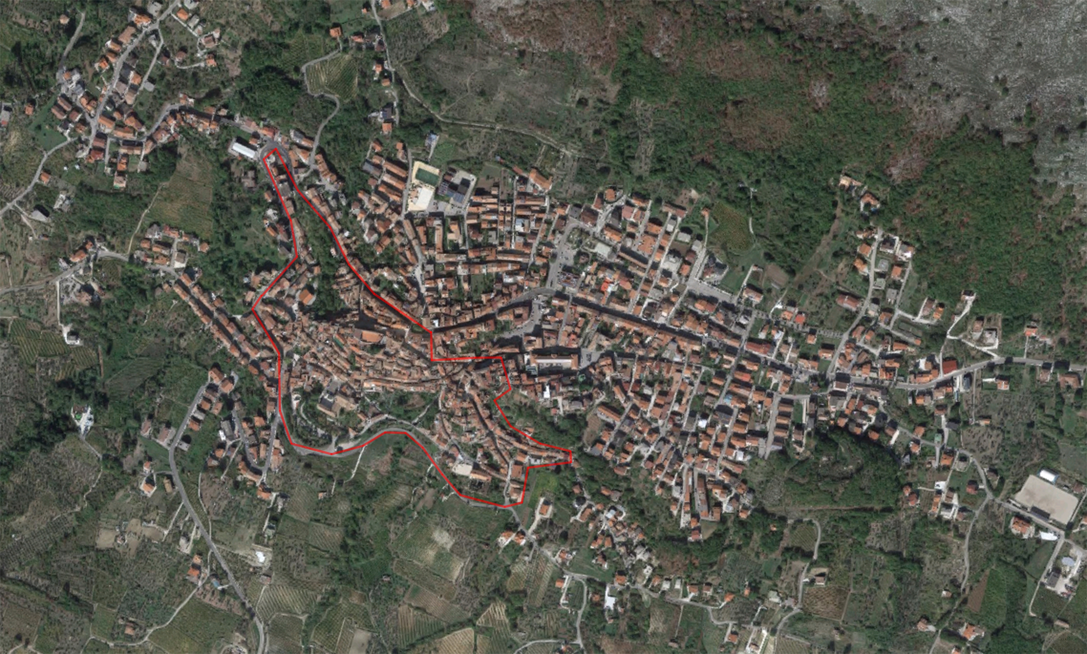 A satellite view of Guardia Sanframondi. The borders of the inner, historical town are marked in red.