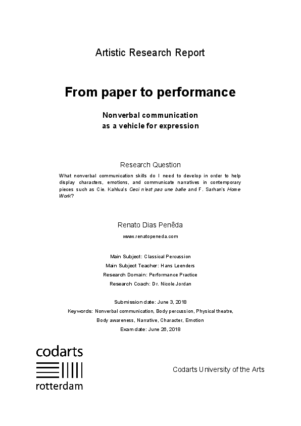 This artistic research project focuses on the use and role of nonverbal communication as a means to effectively communicate narratives and display characters in modern percussion works, with particular emphasis on visual cues, i.e. physical appearance and kinesics – facial expressions, posture, and body and ocular movement. Research into this topic was motivated by the author’s desire to become a more expressive performer and had the added benefit of expanding the author’s solo percussion repertoire. The research strategy applied was the realisation of two case studies, on Cie. Kahlua’s Ceci n’est pas une balle and F. Sarhan’s Home Work. The mixed methods approach to the topic included literature research, analysis of the scores and videos of performances, interviews, coaching by experts in music, theatre and dance, quasi-experiments, and autoethnography. The interventions resulted in the author’s own versions of the compositions, each with its own narrative and corresponding characters, which are made clear by the use of nonverbal cues. In addition, the author designed a general method for preparing engaging performances that can be followed by other musicians and thus provides a contribution to the field. By the end of the research process, the author had improved his body awareness, stage presence, and nonverbal communication skills to the point where he could effectively communicate his artistic ideas to the audience.