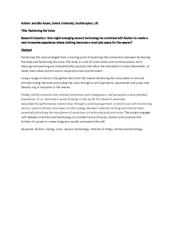 The voice emerges from our vibrating vocal folds, and then our exquisitely responsive and malleable vocal tract sculpts the sounds that emerge. This process is dependent on a wide range of variables – biological, emotional, cultural and contextual – and as such, it is ever-in-flux, under a strange combination of conscious control, unconscious learned habits, and physical limitations and potentials: we fashion our sound. Findlay (2016) contends that clothing intertwines with imagination, self-perception and embodied experience, to co- fabricate a sense of being-in-the-world. Our garments that ‘make’ voice, that shape voice, that project voice, and that literally vibrate with voice, echo the agency we use to choose, shape and move in clothing – grounding it in a dialogue between the ‘biological’ (or more fixed) aspects of embodiment and the tactile, visual and choreographic qualities of clothing. Using ‘voiced’ clothing we stage identity and mark a marginal space that can be played with (Kaiser 2001). Our research examines body/identity/performance relationships through a prototype garment: a trench coat with monitoring sensors used to harness and tease out the synergy between material clothing and internal body, potentially dissolving the boundaries of sensations in fashioning body and voice. Sensors gather data from the body’s interaction with the coat; gestures, movement, EMG, and touch. We then apply different mapping techniques including artificial intelligence and machine learning to create a unique voice for the user that resonates between fashion, performance and voicing. The project engages with debates in fashion and technology to consider future of luxury, fashion and costume that furthers its power to create imaginary worlds and extend the self.