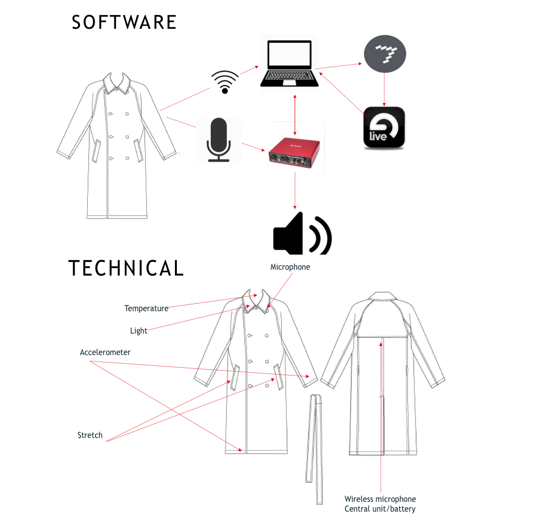 My research interests in this project are concerned with the sensory experience of wearing the trench coat drawing upon the field of affect studies by focusing upon the “practical experience of the clothed body in space” (Ruggerone, 577:2016). I am investigating how this coat affects the wearer, how in the experience of being clothed in this singing coat their focus might shift from what the body is, to what the body does and the feelings that engenders. Our stylistic and physical interactions with the coat such as popping the collar, pushing up the sleeves, tightening the belt can connect to vocal styling through the technology embedded in the coat. I would like to use this session to share the coat, and to contemplate with my peers the gap between visual and vocal styling; the gap between sensation and affect. Can we construct a meaningful connection through this tech enabled trench coat to connect styling the body with styling the voice, or is the gap too large? What is the value in doing this for a live art setting? <<