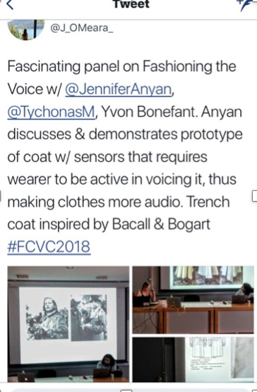 Fashioning the Voice is an interdisciplinary research project that brings together the expertise of Yvon Bonenfant an artist-academic who extends voice across media to explore innovative ways of creating (University College, Cork); Dr. Tychonas Michailidis, whose work focuses on sensor technology and interactions (Research Fellow at Solent University) and myself Associate Professor of the Art of Fashion; my research focuses upon the styled corporeal body and the experience of the (dressed) body.
