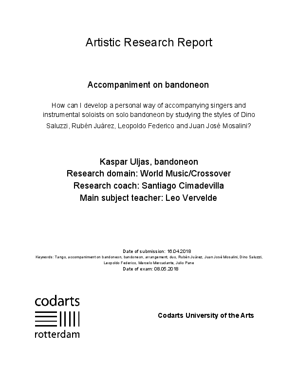 The art of accompaniment is a very specific form of musical expression. It is something completely different from instrumental ensemble playing or solo performance. I used to play jazz accordion for many years prior to my exploration of tango and now, since studying the bandoneon I find myself with the same set of problems – how to play well with others? This pointed me towards my research question: “How can I develop a personal way of accompanying singers and instrumental soloists on solo bandoneon by studying the styles of Dino Saluzzi, Rubén Juárez, Leopoldo Federico, Juan José Mosalini?” Throughout this research, the way of working consisted of transcribing, playing, analyzing the results, writing down my favourite patterns or characteristics/key elements of accompaniments and composing new arrangements. A big part of the data collection consisted of making transcriptions of four well-known bandoneon players from Argentina, who all have a different and comprehensive way of accompanying singers. This study will give a first look into important elements of tango music and how to use these elements in my own artistic work. Nowadays, it is no longer expected for bandoneon players to necessarily have accompaniment skills. I find it absolutely necessary in order to become a more versatile, fully-developed musician.