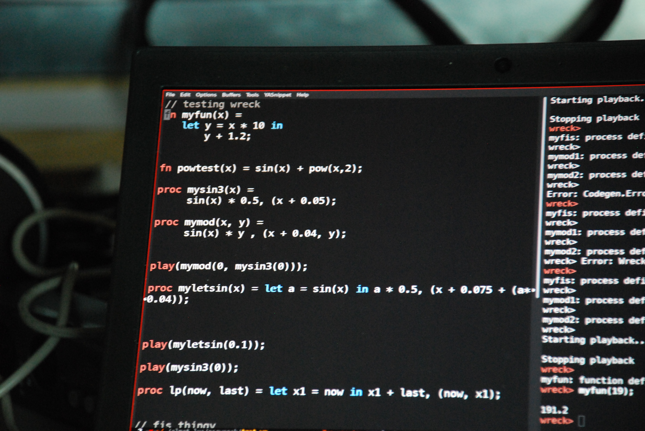 In the process of tayloring WRECK to his own practice, it is interesting to observe how Luc "abstracts" his own approach to sound synthesis and composition, and how this is then formalized to an idyosincratic language that is closely related to the way he thinks, and creates, sound processes.