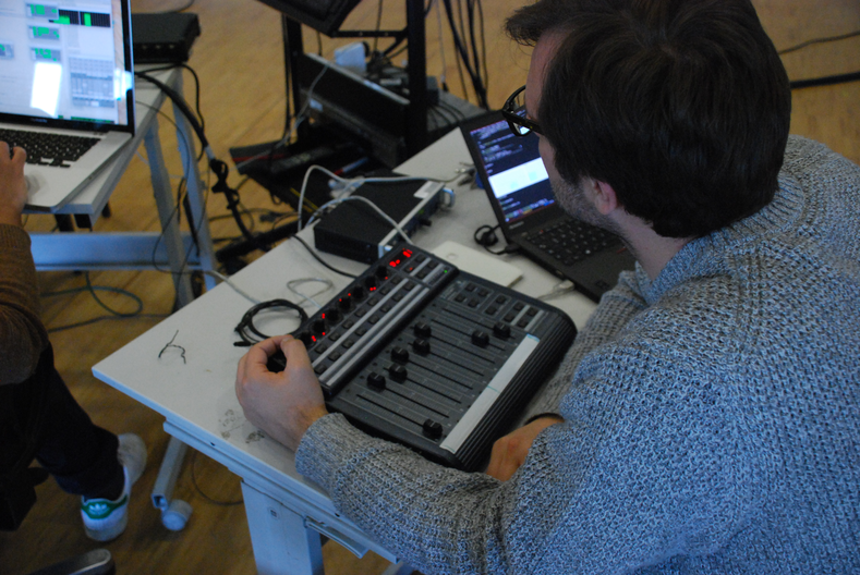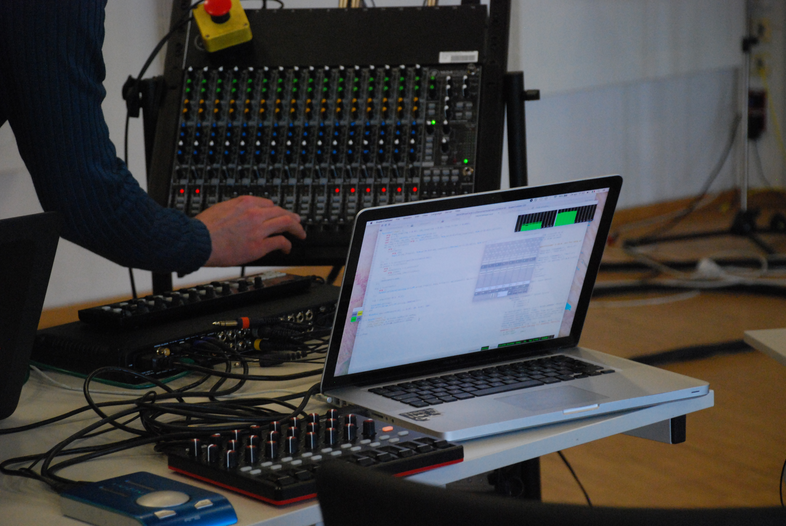 One consisted of two cross coupled oscillators, the other of six oscillators organized in a 6x6 modulation matrix. Each oscillator's phase is calculated by summing up the phases from all the other oscillators plus itself. Before the sum, each single phase is multiplied by a so-called modulation index. In the case of the 6x6 matrix I had 36 modulation indexes, whose values were dependent on the phase of 36 hopf oscillators. These hopf oscillators were organized in 6 groups and each group was synchronizing to a different input (one of the six incoming signals). Inside a group, each of the six hopfs had a different coupling value.