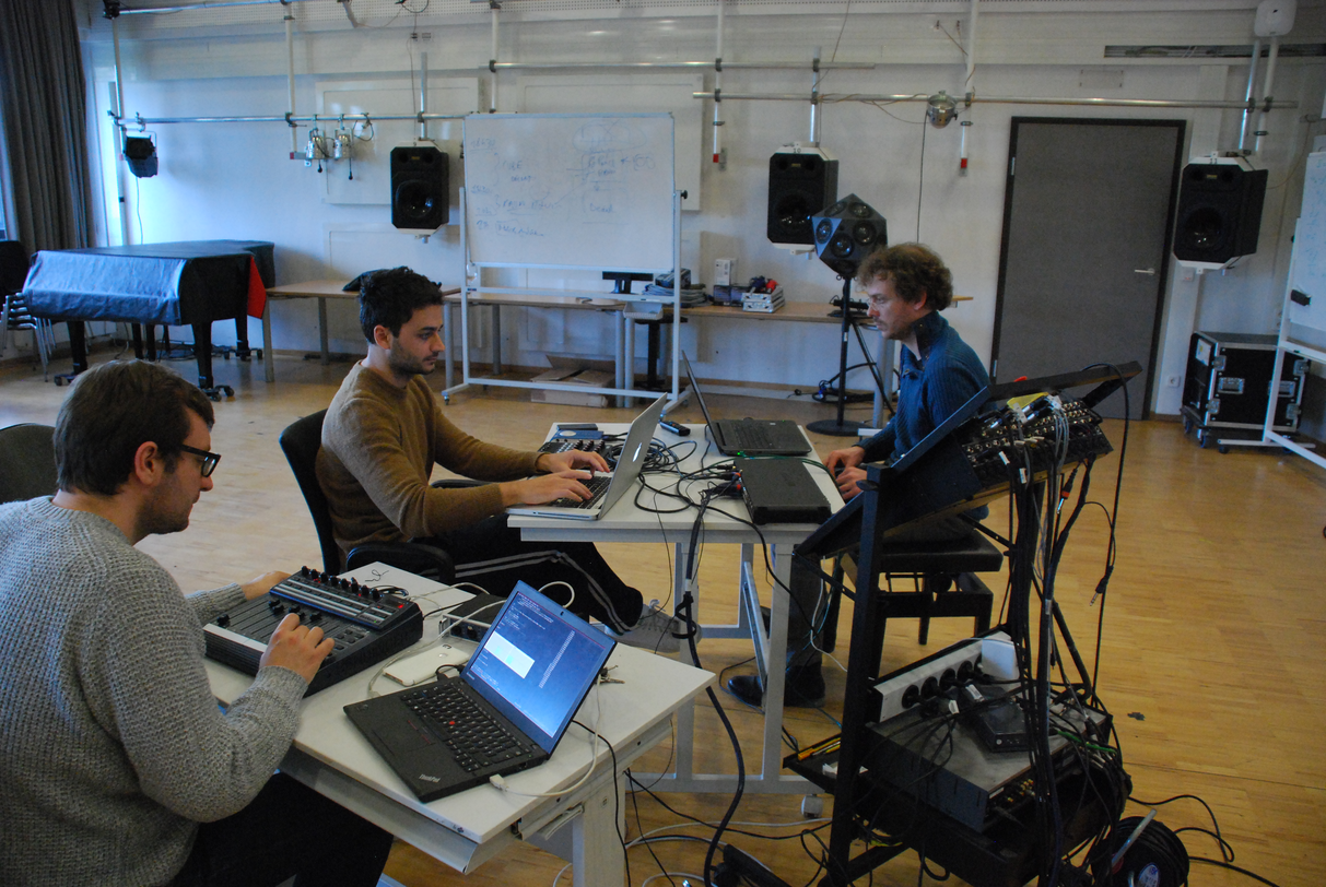 In this series of live electronics "jam sessions" we try to couple three different systems which embed synchronization mechanisms at different levels of their functioning. Each system receives audio from the others and tries to synchronize to the incoming signal. The three systems form the feedback topology depicted below.